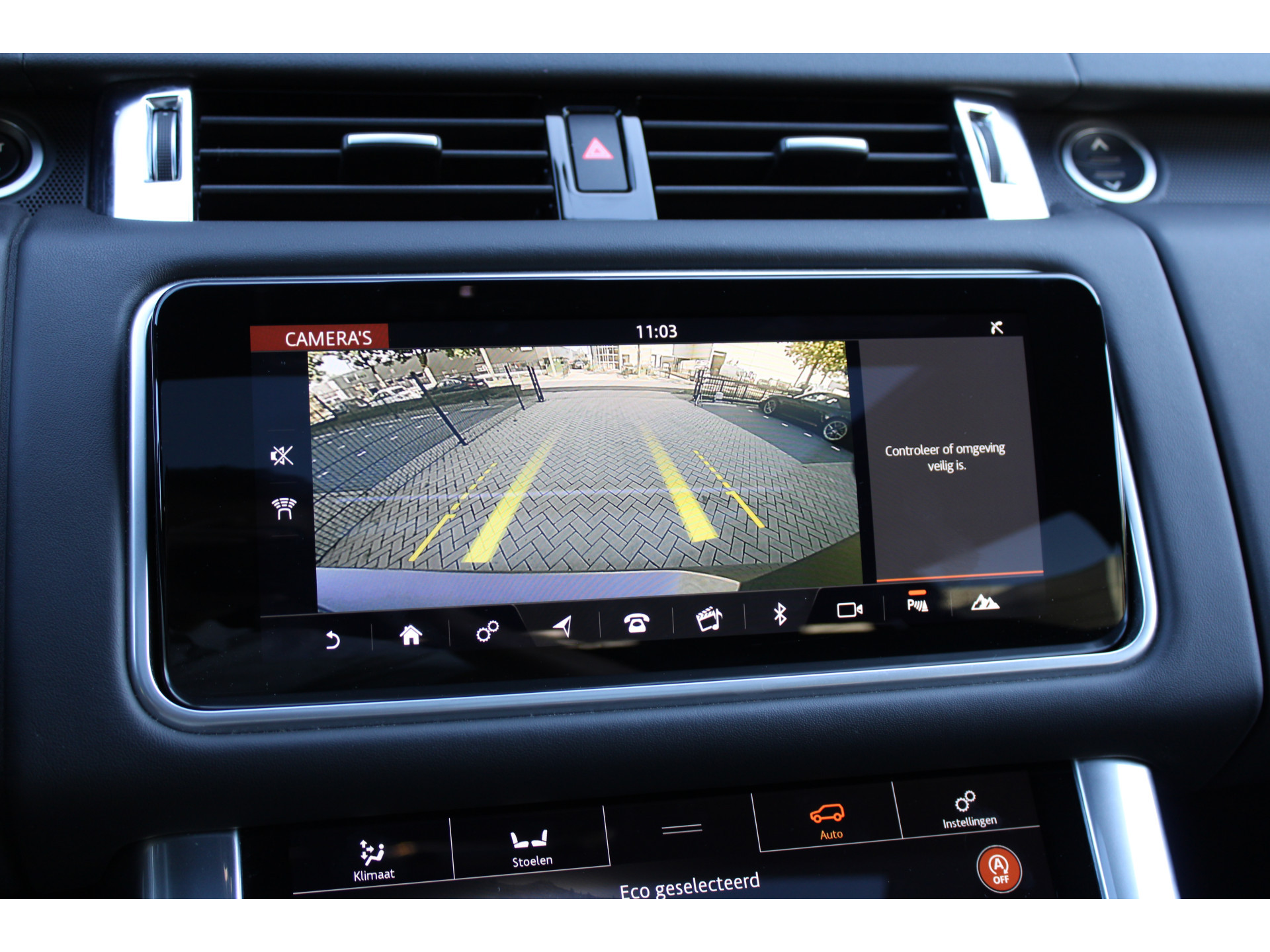 Geavanceerde veiligheidssystemen kijken tijdens elke rit met u mee en schatten continu de risico's in. De auto is voorzien van head-up display, waarbij alle belangrijke informatie wordt geprojecteerd in uw gezichtsveld. U hoeft uw ogen geen seconde van de weg te halen! Een belangrijke bijdrage aan de veiligheid onderweg levert de verkeersbord-detectie in deze Land Rover. Het Lane-keeping systeem zorgt voor een automatisch constante positie binnen de rijstrook. Afdwalen is uitgesloten. De veiligheid van deze auto wordt verder verhoogd door dodehoekdetectie, hill hold functie, brake assist, vermoeidheidsherkenning en bandenspanningcontrolesysteem.