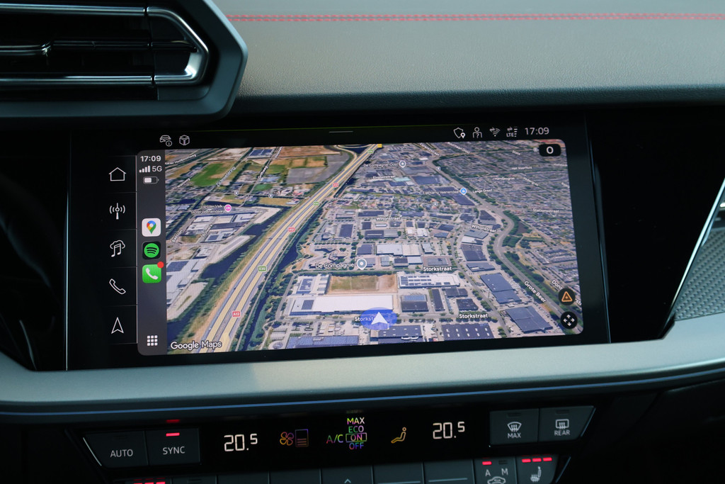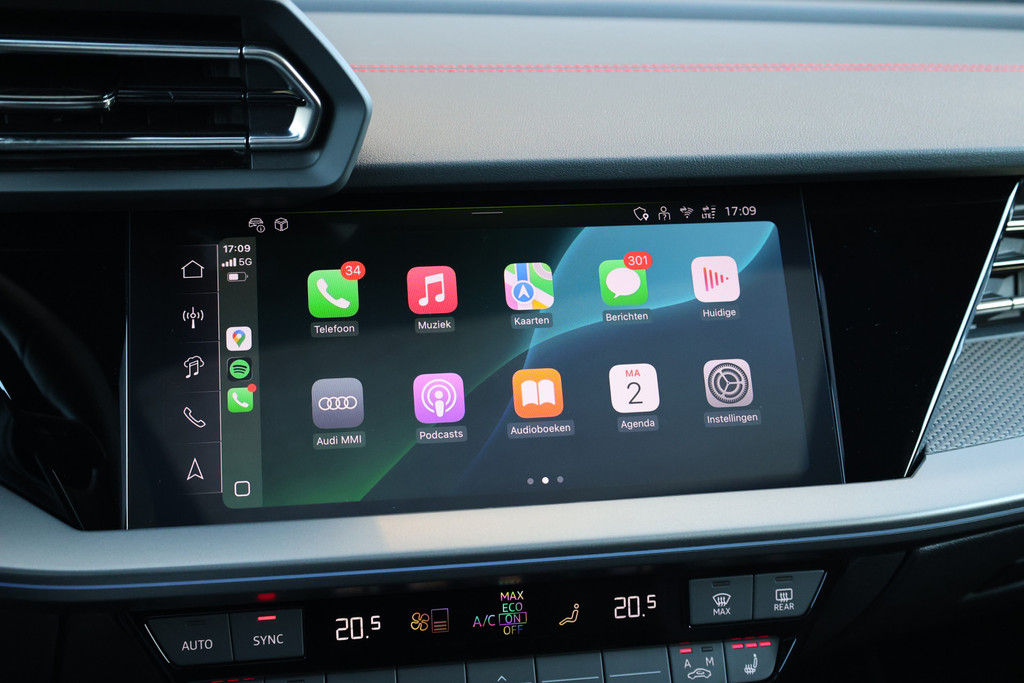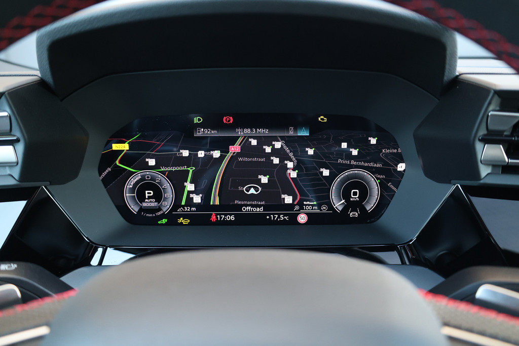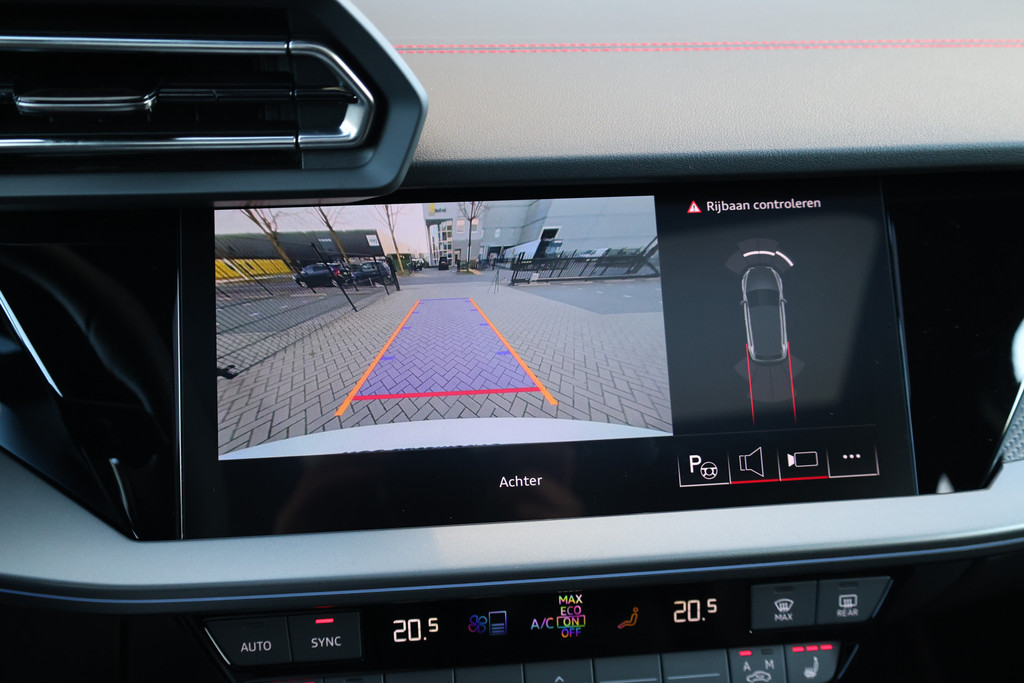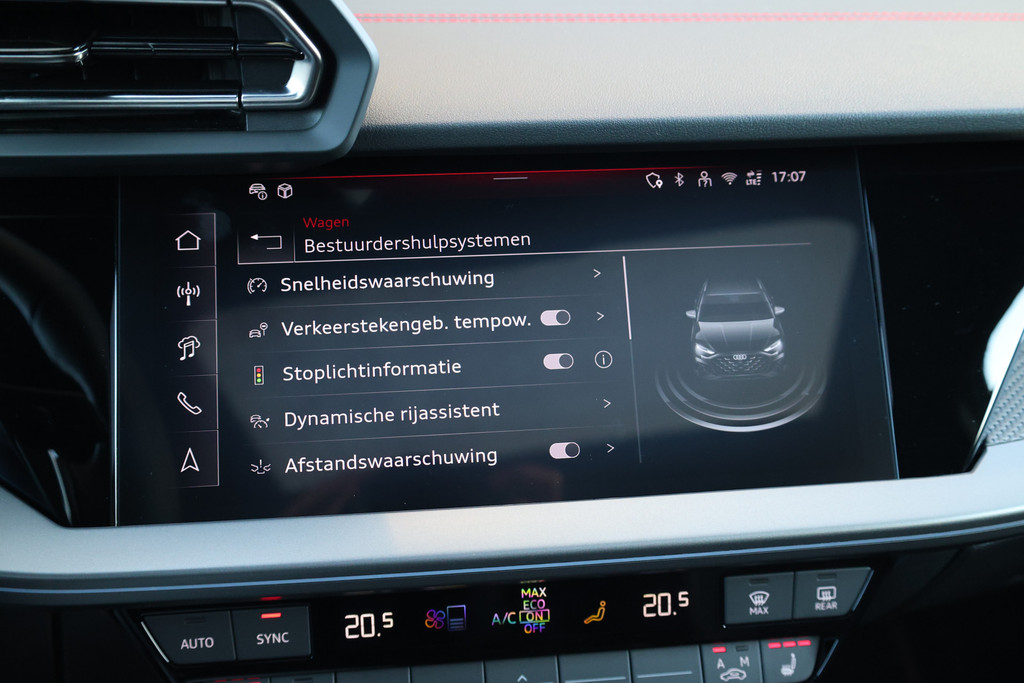 Tijdens de rit wordt u als bestuurder ondersteund door verschillende systemen die de weg en uw omgeving in de gaten houden. Verkeersbord-detectie herkent verkeersborden en toont deze op het instrumentarium van de auto. Onbedoeld buiten de rijstrook raken wordt voorkomen door het Lane-keeping systeem. Mindert een voorligger onverwachts te veel vaart, dan komt de forward collision warning in actie en waarschuwt meteen. In deze Audi vinden we verder een dodehoekdetectie, hill hold functie, brake assist, vermoeidheidsherkenning en bandenspanningcontrolesysteem.